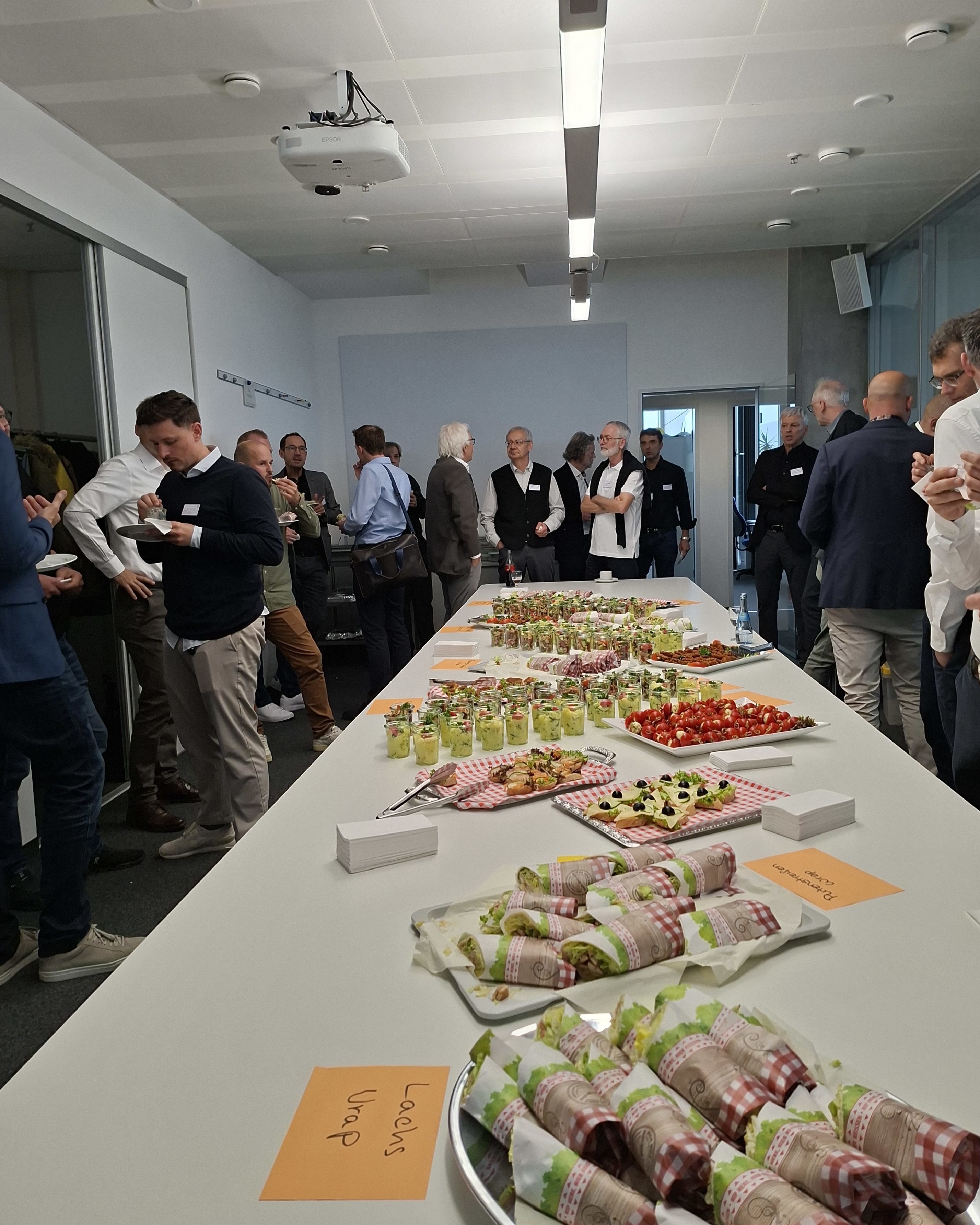 Beim anschließenden Get-Together nutzten die Teilnehmenden die Gelegenheit zu anregenden Gesprächen bei Snacks und Getränken - ganz im Sinne des Veranstaltungsziels: Austausch, Inspiration und gemeinsames Weiterdenken für eine nachhaltige Baukultur.