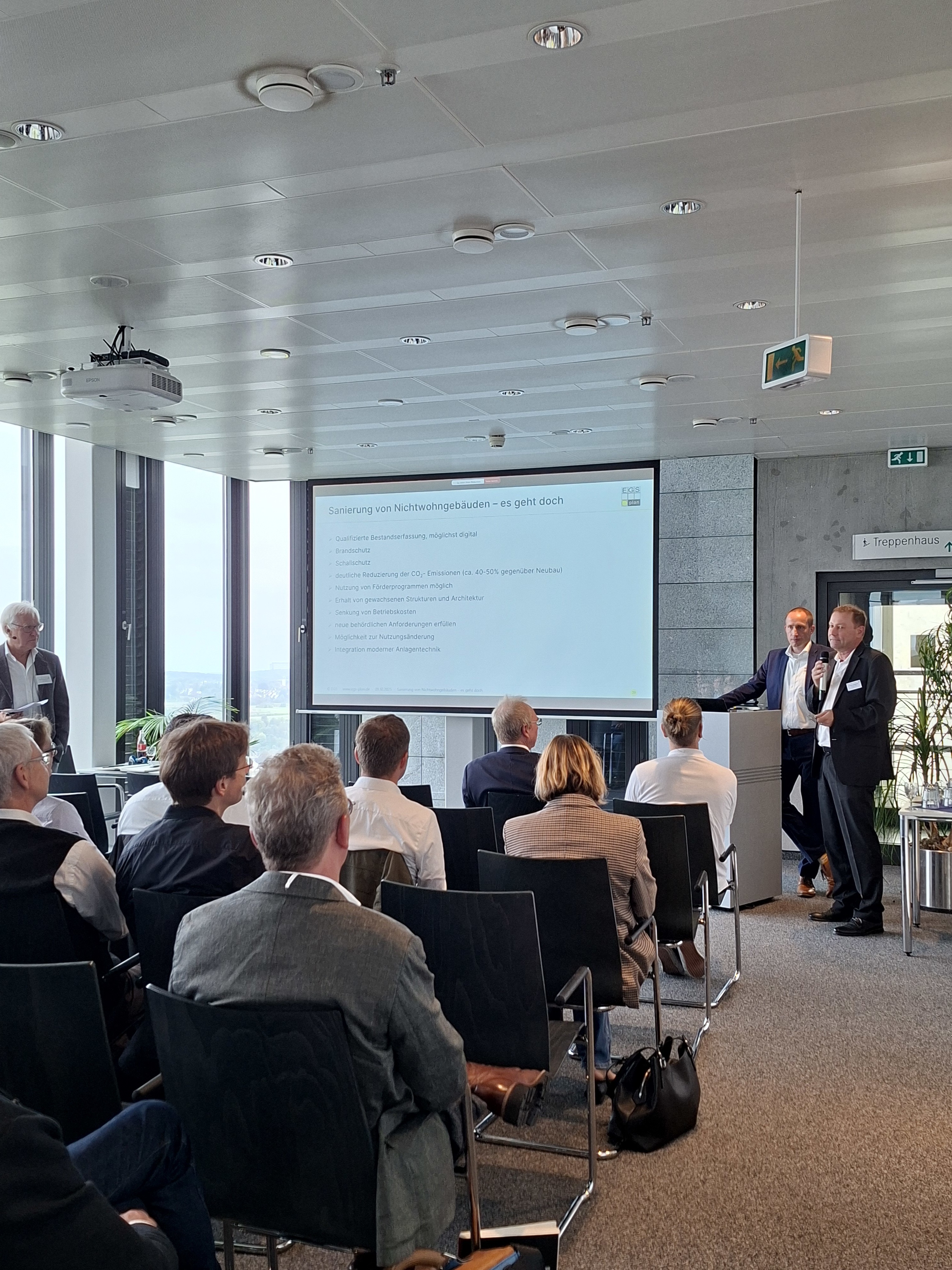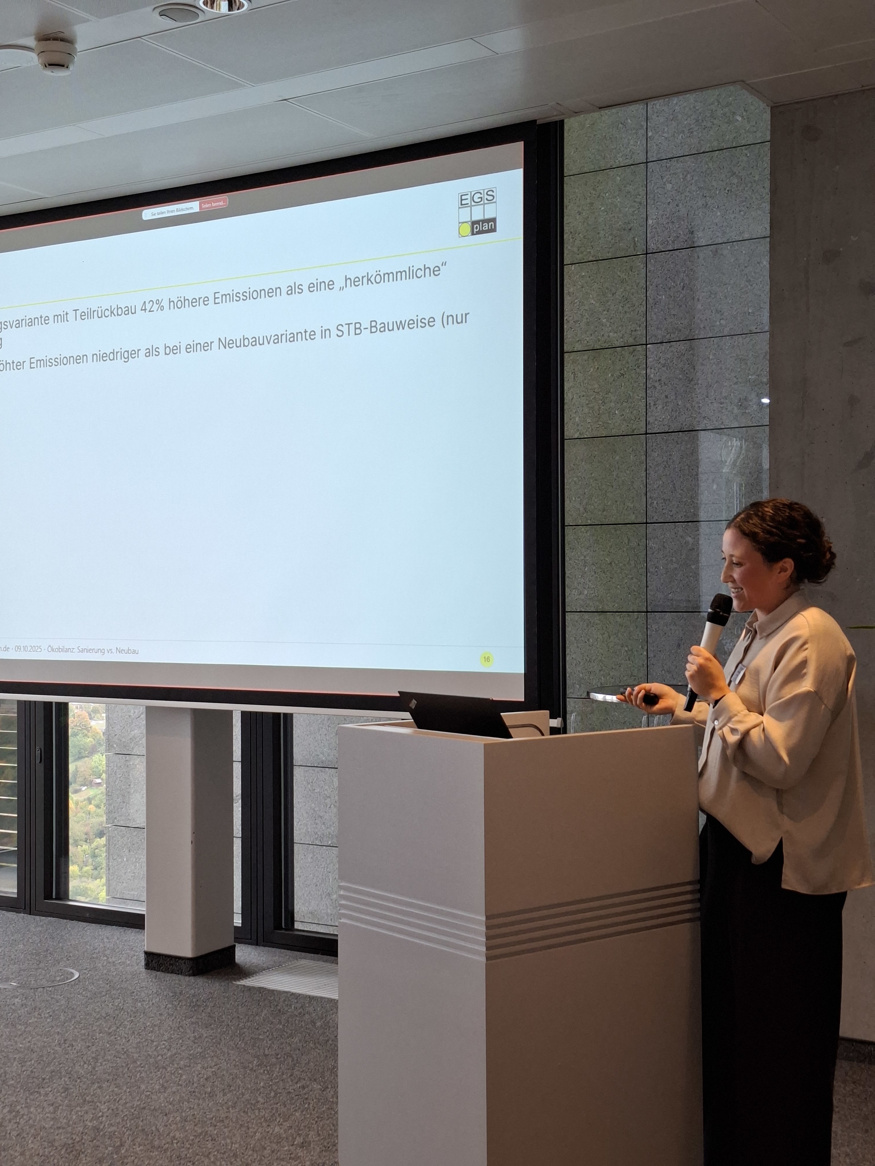 Darauf folgte ein Beitrag von Christian Dorer vom Finanzministerium Baden-Württemberg, der die Wärme-Strategie für rund 8000 Landesgebäuden vorstellte. Nach einer kurzen Kaffeepause widmete sich Frau Gatti von EGS-plan der Frage, ob die sogenannten „grauen Emissionen“ über Sanierung oder Neubau entscheiden sollten. Ihre Ökobilanzvergleiche verdeutlichten, dass eine Sanierung nicht in jedem Fall die ökologisch beste Lösung darstellt. Teilrückbau, Holzhybridbauweisen oder kombinierte Ansätze können mitunter ebenso vorteilhaft sein.