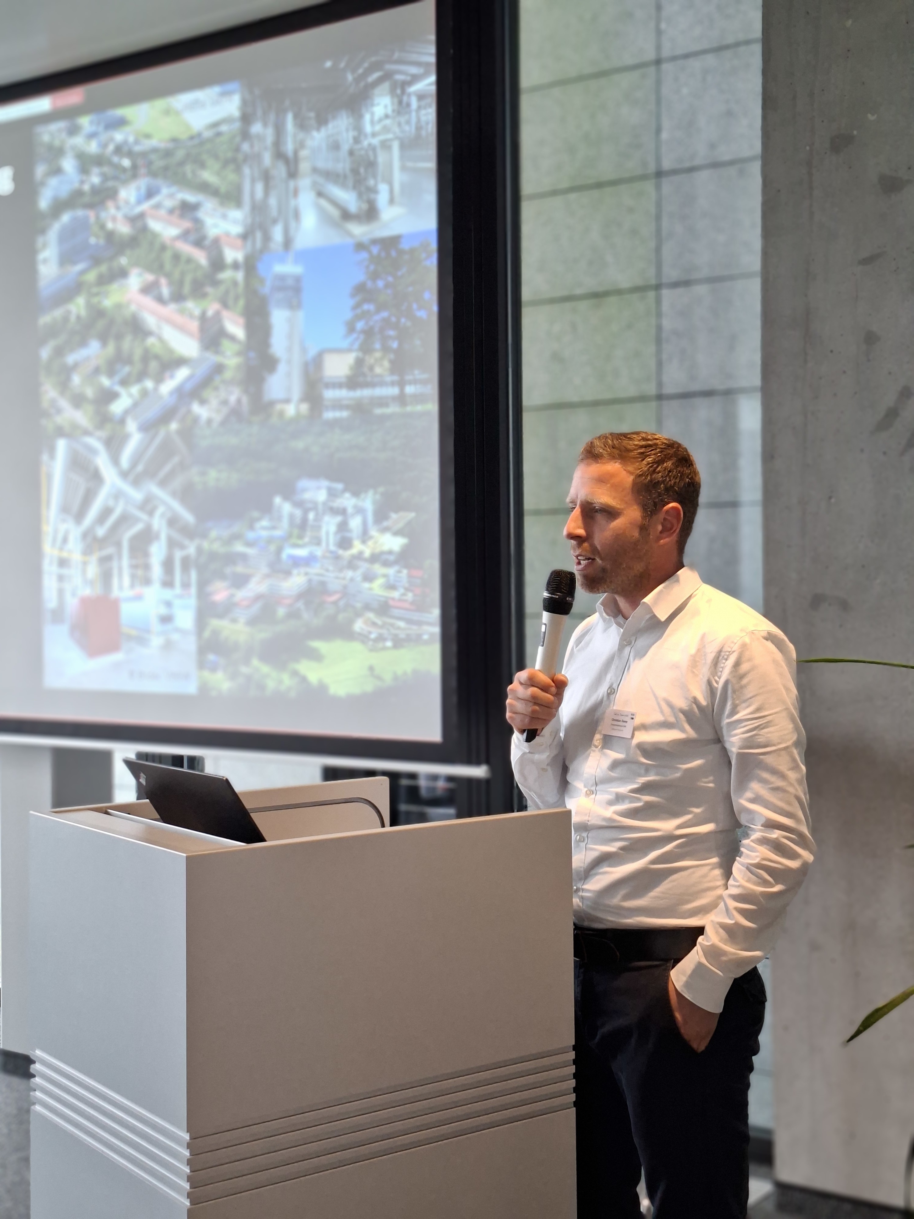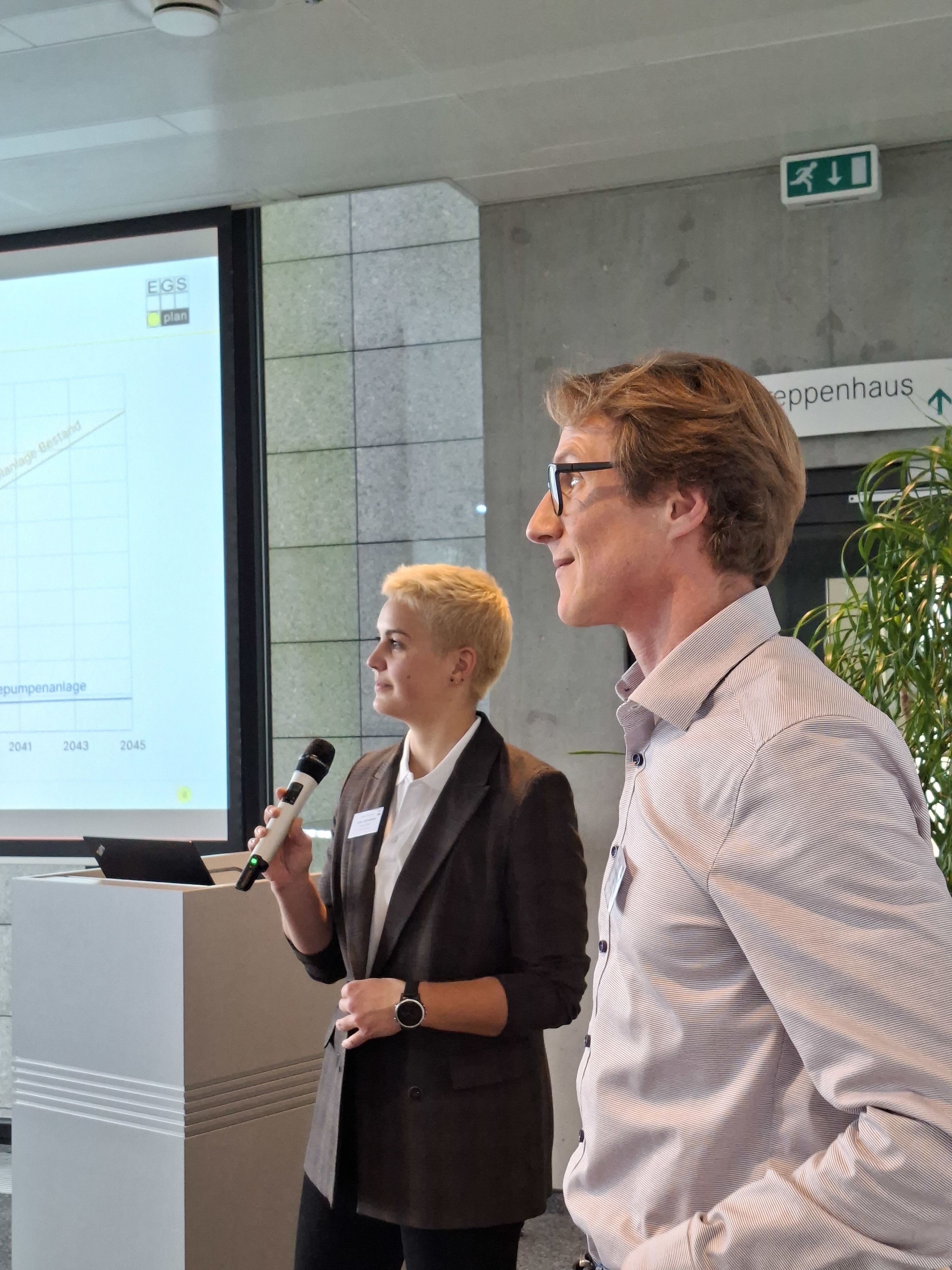 Im Anschluss erläuterte Dr. Mathieu Riegger von der SWSG den Weg der Stuttgarter Wohnungs- und Städtebaugesellschaft hin zu lebens- und preiswerten, zugleich klimafreundlichen Quartieren. 2024 wurde erstmals der Zielwert von vier Prozent CO₂-Reduktion im Bestand erreicht. Begleitet wird dieser Prozess von EGS-plan, vertreten durch Frau Schmückert, insbesondere bei der Umsetzung serieller Heizungssanierungen.