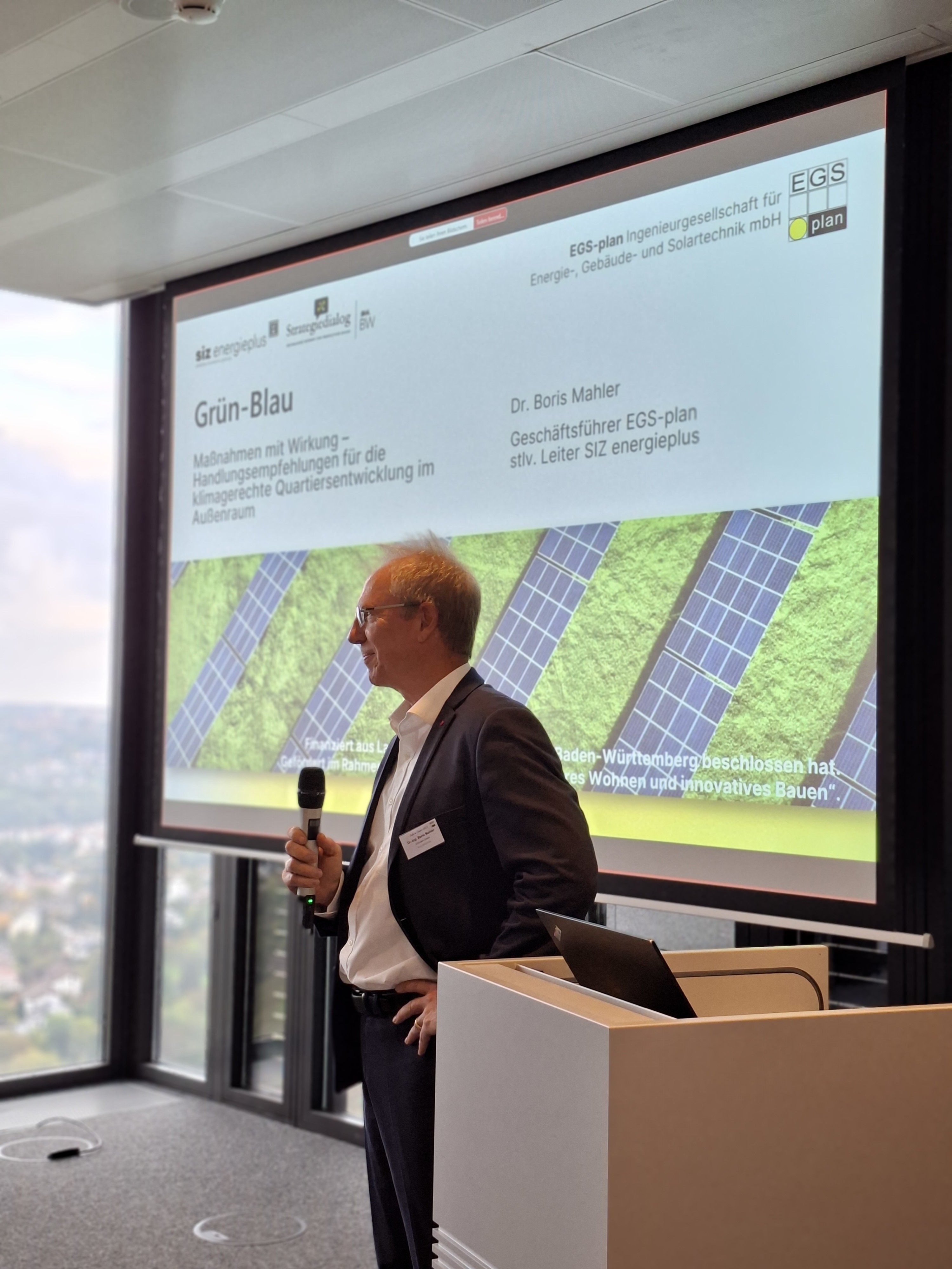 Im weiteren Verlauf gab Dr. Felder von EGS-plan spannende Einblicke in das Monitoring im Gebäudebestand mittels LoRaWan, das künftig als Werkzeug zur kontinuierlichen Klimadatenanalyse eingesetzt wird. Dr. Boris Mahler präsentierte anschließend Ergebnisse der Forschungsstudie „Grün-Blau“, die aufzeigte, welche